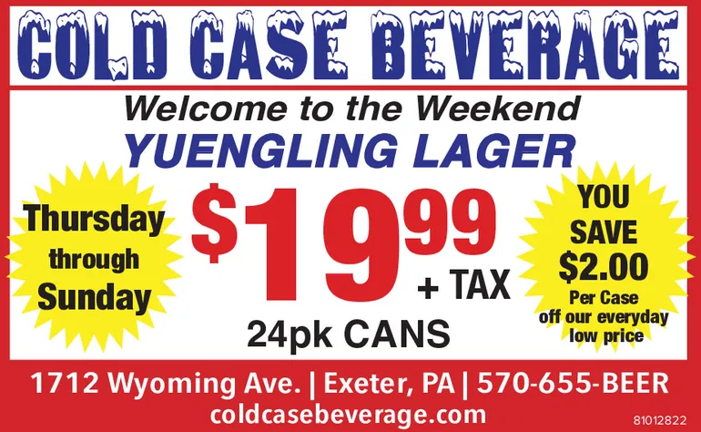 COLD CASE BEVERAGE Welcome to the Weekend YUENGLING LAGER Thursday through Sunday $19999 24pk CANS 1712 Wyoming Ave. | Exeter, PA | 570-655-BEER coldcasebeverage.com th YOU SAVE $2.00 Per Case off our everyday low price TAX 81012822 COLD CASE BEVERAGE Welcome to the Weekend YUENGLING LAGER Thursday through Sunday $ 19999 24pk CANS 1712 Wyoming Ave. | Exeter , PA | 570-655 - BEER coldcasebeverage.com th YOU SAVE $ 2.00 Per Case off our everyday low price TAX 81012822
