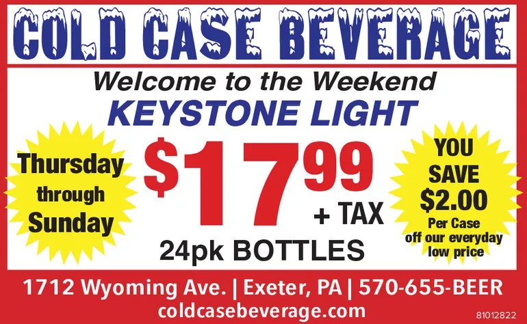 COLD CASE BEVERAGE Welcome to the Weekend KEYSTONE LIGHT Thursday through Sunday $1799 + TAX YOU SAVE $2.00 Per Case off our everyday low price 24pk BOTTLES 1712 Wyoming Ave. | Exeter, PA | 570-655-BEER coldcasebeverage.com 81012822 COLD CASE BEVERAGE Welcome to the Weekend KEYSTONE LIGHT Thursday through Sunday $ 1799 + TAX YOU SAVE $ 2.00 Per Case off our everyday low price 24pk BOTTLES 1712 Wyoming Ave. | Exeter , PA | 570-655 - BEER coldcasebeverage.com 81012822