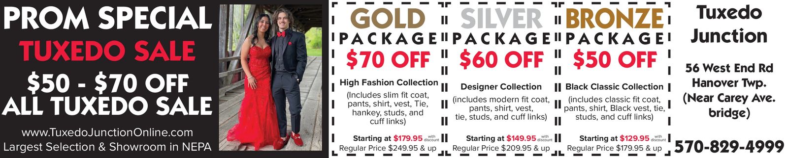 PROM SPECIAL TUXEDO SALE $50 - $70 OFF ALL TUXEDO SALE www.Tuxedo Junction Online.com Largest Selection & Showroom in NEPA GOLD SILVER BRONZE IPACKAGE" PACKAGE" PACKAGEI ! $70 OFF $60 OFF $50 OFF || | II High Fashion Collection II (Includes slim fit coat, pants, shirt, vest, Tie, hankey, studs, and cuff links) Designer Collection (includes modern fit coat, pants, shirt, vest, II tie, studs, and cuff links) II Starting at $179.95 discount II Regular Price $249.95 & up - JL || Black Classic Collection | (includes classic fit coat, pants, shirt, Black vest, tie, studs, and cuff links) Starting at $149.95 discount || Regular Price $209.95 & up Starting at $129.95 discount Regular Price $179.95 & up - Tuxedo Junction 56 West End Rd Hanover Twp. (Near Carey Ave. bridge) 570-829-4999 PROM SPECIAL TUXEDO SALE $ 50 - $ 70 OFF ALL TUXEDO SALE www.Tuxedo Junction Online.com Largest Selection & Showroom in NEPA GOLD SILVER BRONZE IPACKAGE " PACKAGE " PACKAGEI ! $ 70 OFF $ 60 OFF $ 50 OFF || | II High Fashion Collection II ( Includes slim fit coat , pants , shirt , vest , Tie , hankey , studs , and cuff links ) Designer Collection ( includes modern fit coat , pants , shirt , vest , II tie , studs , and cuff links ) II Starting at $ 179.95 discount II Regular Price $ 249.95 & up - JL || Black Classic Collection | ( includes classic fit coat , pants , shirt , Black vest , tie , studs , and cuff links ) Starting at $ 149.95 discount || Regular Price $ 209.95 & up Starting at $ 129.95 discount Regular Price $ 179.95 & up - Tuxedo Junction 56 West End Rd Hanover Twp . ( Near Carey Ave. bridge ) 570-829-4999