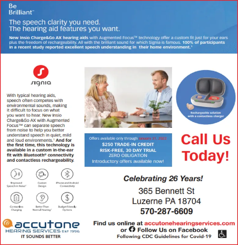 Be Brilliant The speech clarity you need. The hearing aid features you want. New Insio Charge&Go AX hearing aids with Augmented Focus technology offer a custom fit just for your ears plus the freedom of rechargeability. All with the brilliant sound for which Signia is famous. 100% of participants in a recent study reported excellent speech understanding in their home environment.¹ signia With typical hearing aids, speech often competes with environmental sounds, making it difficult to focus on what you want to hear. New Insio Charge&Go AX with Augmented Focus can separate speech from noise to help you better understand speech in quiet, mild and loud environments. And for the first time, this technology is available in a custom in-the-ear fit with Bluetooth® connectivity and contactless rechargeability. (0) Improved Speech in Noise Contactless Charging Custom Design Better Than Normal Hearing Phone and Android Connectivity $ Budget Friendly Optiona accutone HEARING SERVICES Est 1996 IT SOUNDS BETTER offers available only through January 31, 2022 $250 TRADE-IN CREDIT RISK-FREE, 30 DAY TRIAL ZERO OBLIGATION Introductory offers available now! Rechargeable solution with a contactless charger Call Us Today! Celebrating 26 Years! 365 Bennett St Luzerne PA 18704 570-287-6609 Find us online at accutonehearingservices.com or Follow Us on Facebook Following CDC Guidelines for Covid-19 Be Brilliant The speech clarity you need . The hearing aid features you want . New Insio Charge & Go AX hearing aids with Augmented Focus technology offer a custom fit just for your ears plus the freedom of rechargeability . All with the brilliant sound for which Signia is famous . 100 % of participants in a recent study reported excellent speech understanding in their home environment.¹ signia With typical hearing aids , speech often competes with environmental sounds , making it difficult to focus on what you want to hear . New Insio Charge & Go AX with Augmented Focus can separate speech from noise to help you better understand speech in quiet , mild and loud environments . And for the first time , this technology is available in a custom in - the - ear fit with Bluetooth® connectivity and contactless rechargeability . ( 0 ) Improved Speech in Noise Contactless Charging Custom Design Better Than Normal Hearing Phone and Android Connectivity $ Budget Friendly Optiona accutone HEARING SERVICES Est 1996 IT SOUNDS BETTER offers available only through January 31 , 2022 $ 250 TRADE - IN CREDIT RISK - FREE , 30 DAY TRIAL ZERO OBLIGATION Introductory offers available now ! Rechargeable solution with a contactless charger Call Us Today ! Celebrating 26 Years ! 365 Bennett St Luzerne PA 18704 570-287-6609 Find us online at accutonehearingservices.com or Follow Us on Facebook Following CDC Guidelines for Covid - 19