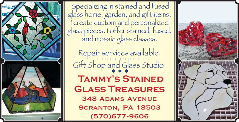 Specializing in stained and fused glass home, garden, and gift items. I create custom and personalized glass pieces. I offer stained, fused, and mosaic glass classes. Repair services available. Gift Shop and Glass Studio. TAMMY'S STAINED GLASS TREASURES 348 ADAMS AVENUE SCRANTON, PA 18503 (570)677-9606 Specializing in stained and fused glass home, garden, and gift items. I create custom and personalized glass pieces. I offer stained, fused, and mosaic glass classes. Repair services available. Gift Shop and Glass Studio. TAMMY'S STAINED GLASS TREASURES 348 ADAMS AVENUE SCRANTON, PA 18503 (570)677-9606