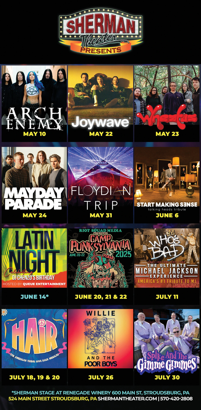 990.00 ARCH SHERMAN Theater PRESENTS ENEMY Joywave MAY 10 MAY 22 MAY 23 FLOYDIAN MAYDAY FLOYDIAN PARADE MAY 24 TRIP MAY 31 START MAKING SENSE talking heads tribute JUNE 6 LATIN NIGHT DJ CHENZO'S BIRTHDAY HOSTED BY QUEUE ENTERTAINMENT JUNE 14* RIOT SQUAD MEDIA PRESENTS CAMP PUNKSYLVANIA JUNE 20-22 2025 JUNE 20, 21 & 22 WILLIE JAM WHOS BADA THRILLING FANS SINCE THE ULTIMATE MICHAEL JACKSON EXPERIENCE AMERICA'S #1 TRIBUTE TO MJ JULY 11 HAIR THE AMERICAN TRIBAL LOVE ROCK MUSICAL JULY 18, 19 & 20 AND THE POOR BOYS JULY 26 Spike And The Gimme Gimmes JULY 30 *SHERMAN STAGE AT RENEGADE WINERY 600 MAIN ST, STROUDSBURG, PA 524 MAIN STREET STROUDSBURG, PA SHERMANTHEATER.COM | 570-420-2808 990.00 ARCH SHERMAN Theater PRESENTS ENEMY Joywave MAY 10 MAY 22 MAY 23 FLOYDIAN MAYDAY FLOYDIAN PARADE MAY 24 TRIP MAY 31 START MAKING SENSE talking heads tribute JUNE 6 LATIN NIGHT DJ CHENZO'S BIRTHDAY HOSTED BY QUEUE ENTERTAINMENT JUNE 14 * RIOT SQUAD MEDIA PRESENTS CAMP PUNKSYLVANIA JUNE 20-22 2025 JUNE 20 , 21 & 22 WILLIE JAM WHOS BADA THRILLING FANS SINCE THE ULTIMATE MICHAEL JACKSON EXPERIENCE AMERICA'S # 1 TRIBUTE TO MJ JULY 11 HAIR THE AMERICAN TRIBAL LOVE ROCK MUSICAL JULY 18 , 19 & 20 AND THE POOR BOYS JULY 26 Spike And The Gimme Gimmes JULY 30 * SHERMAN STAGE AT RENEGADE WINERY 600 MAIN ST , STROUDSBURG , PA 524 MAIN STREET STROUDSBURG , PA SHERMANTHEATER.COM | 570-420-2808